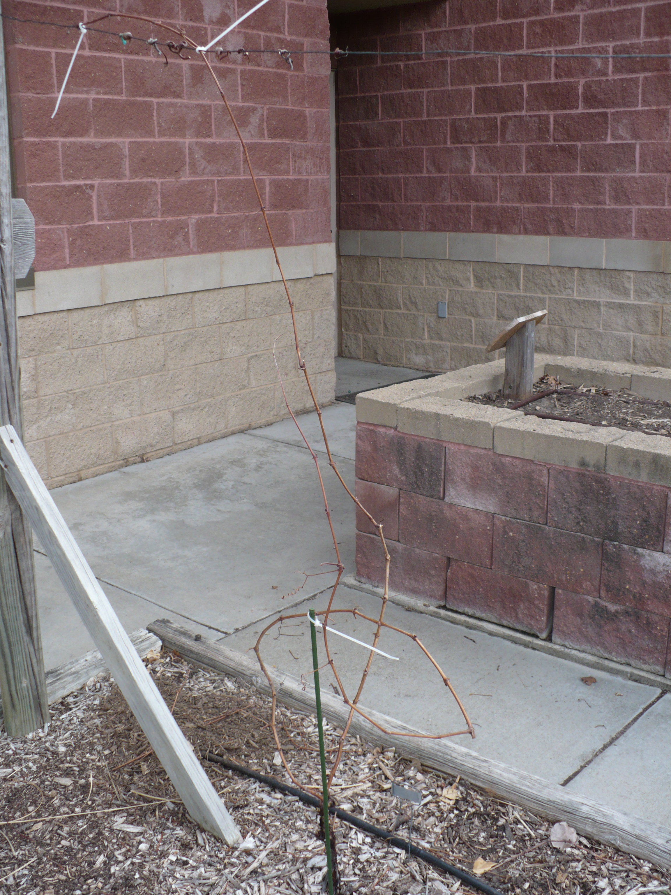 Here a young ‘Concord’ grape has been pruned and tied up to the trellis. These two vines will form the main trunk as the vine gets older. We also pruned the older grapevines.