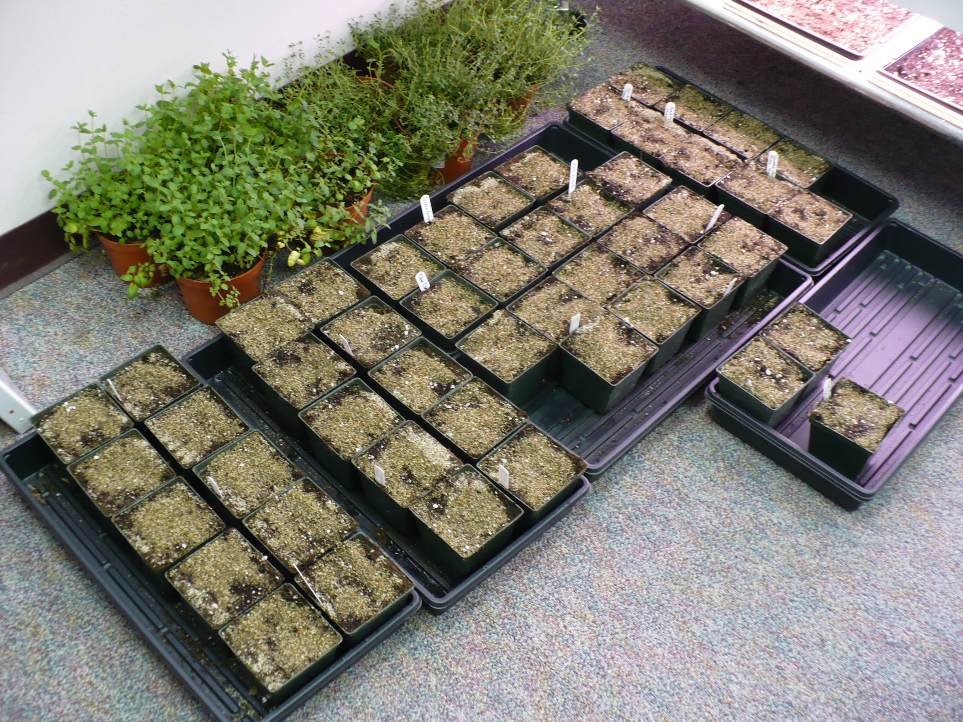 Newly planted tomatoes, peppers, and eggplant await the opportunity to get under the grow lights in my office.