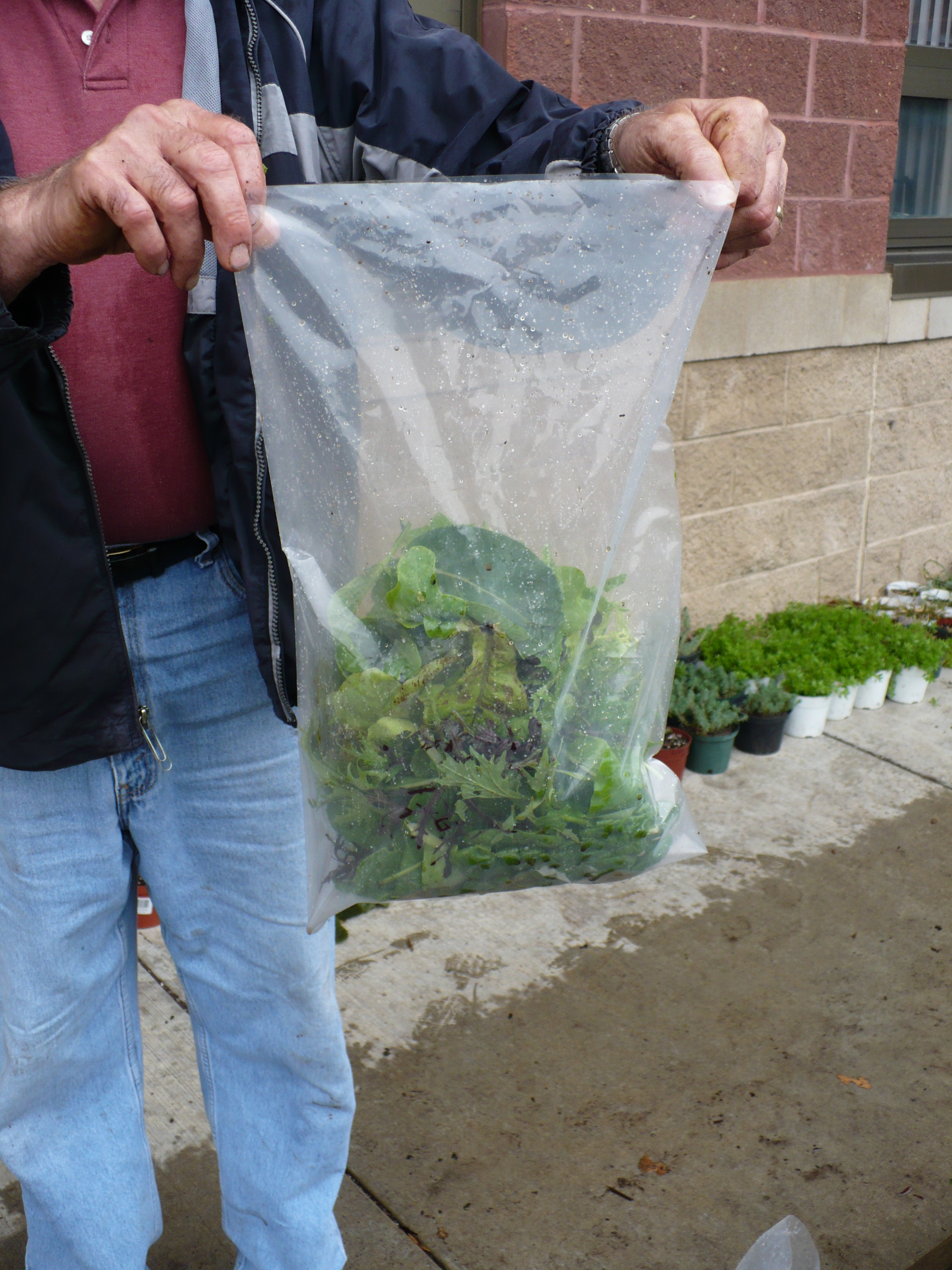 We harvested all the large leaves from the mesclun, the largest spinach leaves, and some of the largest lettuce leaves. We ended up with a bag full!