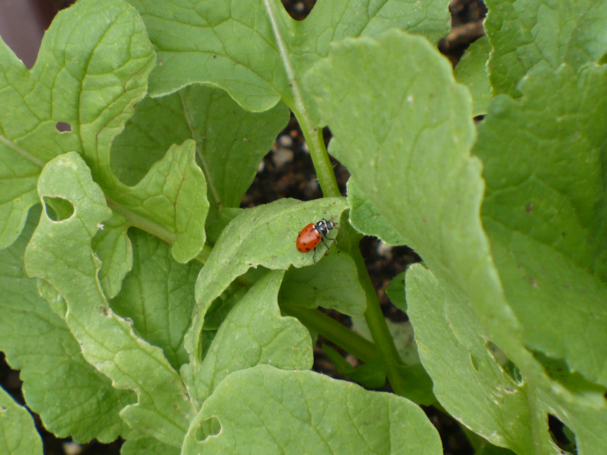 Can you see them? They are pretty small. These little black guys are called Flea Beetles. You can get the whole story about flea beetles here. Our pest control guide says to apply insecticide at the first sign of damage, which may be a bit hasty. The 3 products that I would consider using for control are: neem oil, rotenone/pyrethrin, or permethrin. The first two are organic, and permethrin is a very safe synthetic. Given a low population, I would use neem oil first. If I didn’t get good control or the problem reoccured with a larger population, I would try the other two products.