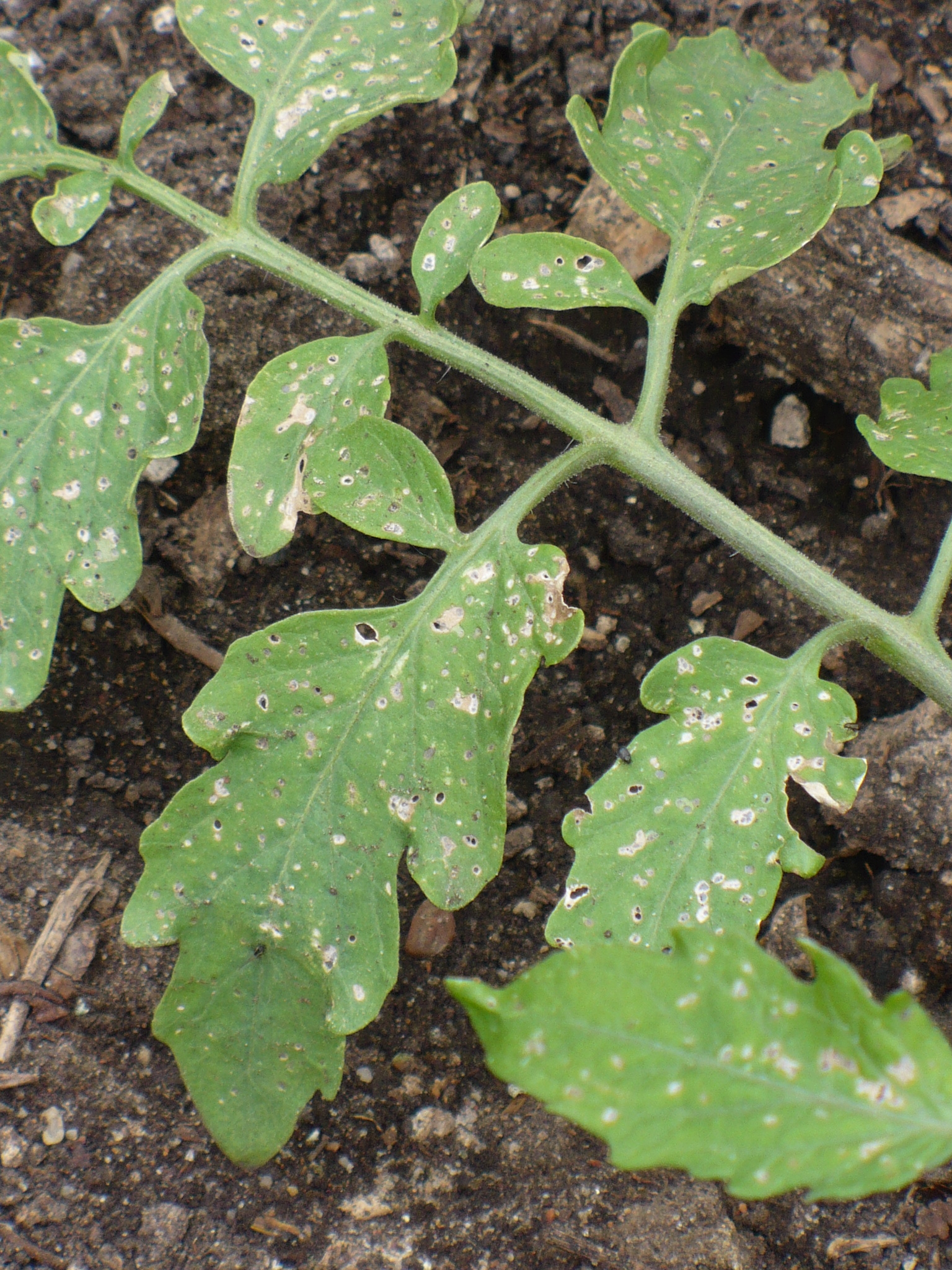 The tomatoes have been looking good overall, but I had seen a few tiny holes in the leaves. I didn’t see any insects though, so I thought I’d just leave it alone. Today I inspected the plants, and the damage seems to be much worse. (Although the plants are still generally healthy, and the damage hasn’t reached the newer leaves yet.)