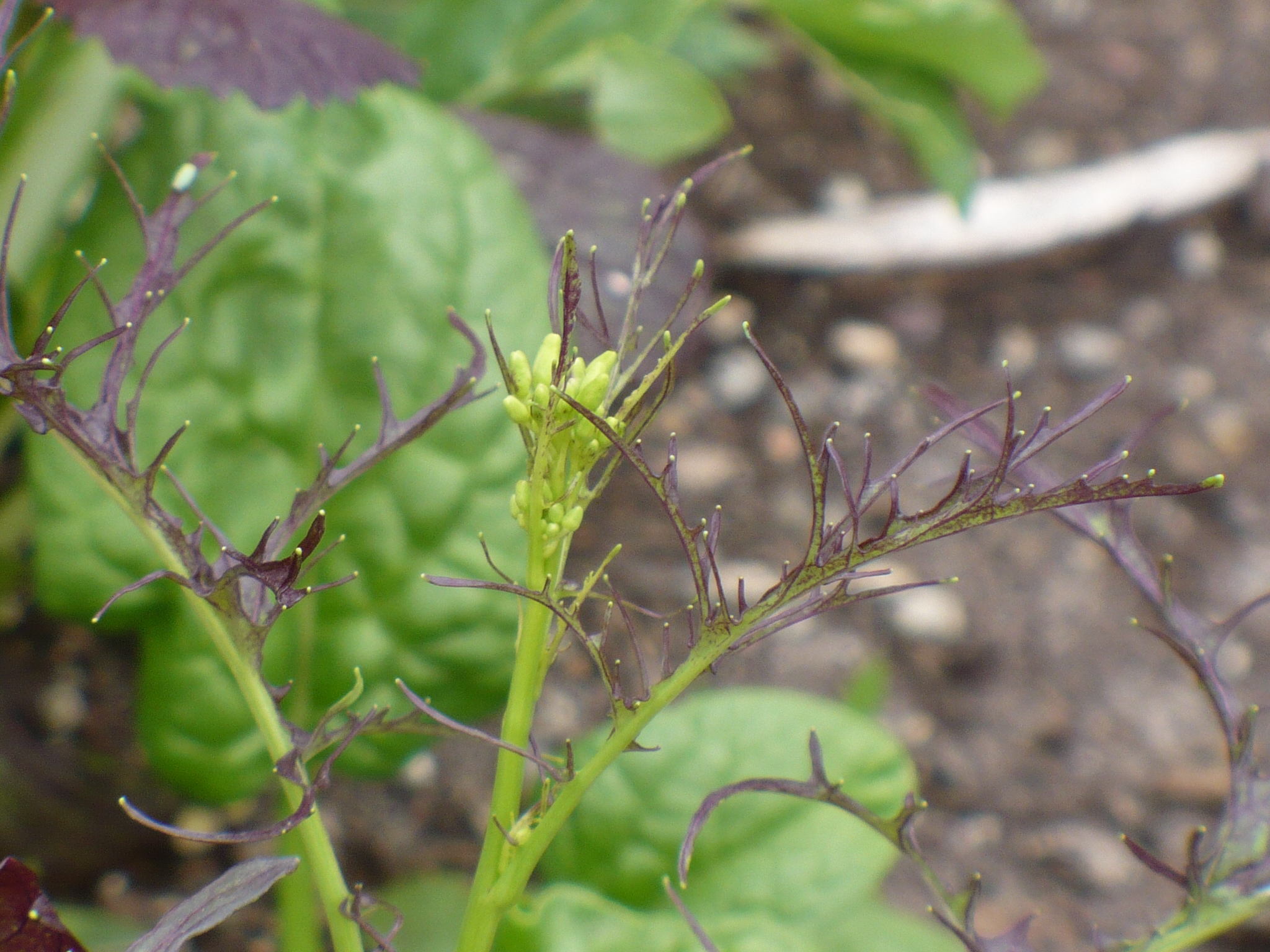 The Ruby Streaks Mustard in the Salad Garden is starting to bolt (go to flower). Happily, the flowers are also edible and delicious!