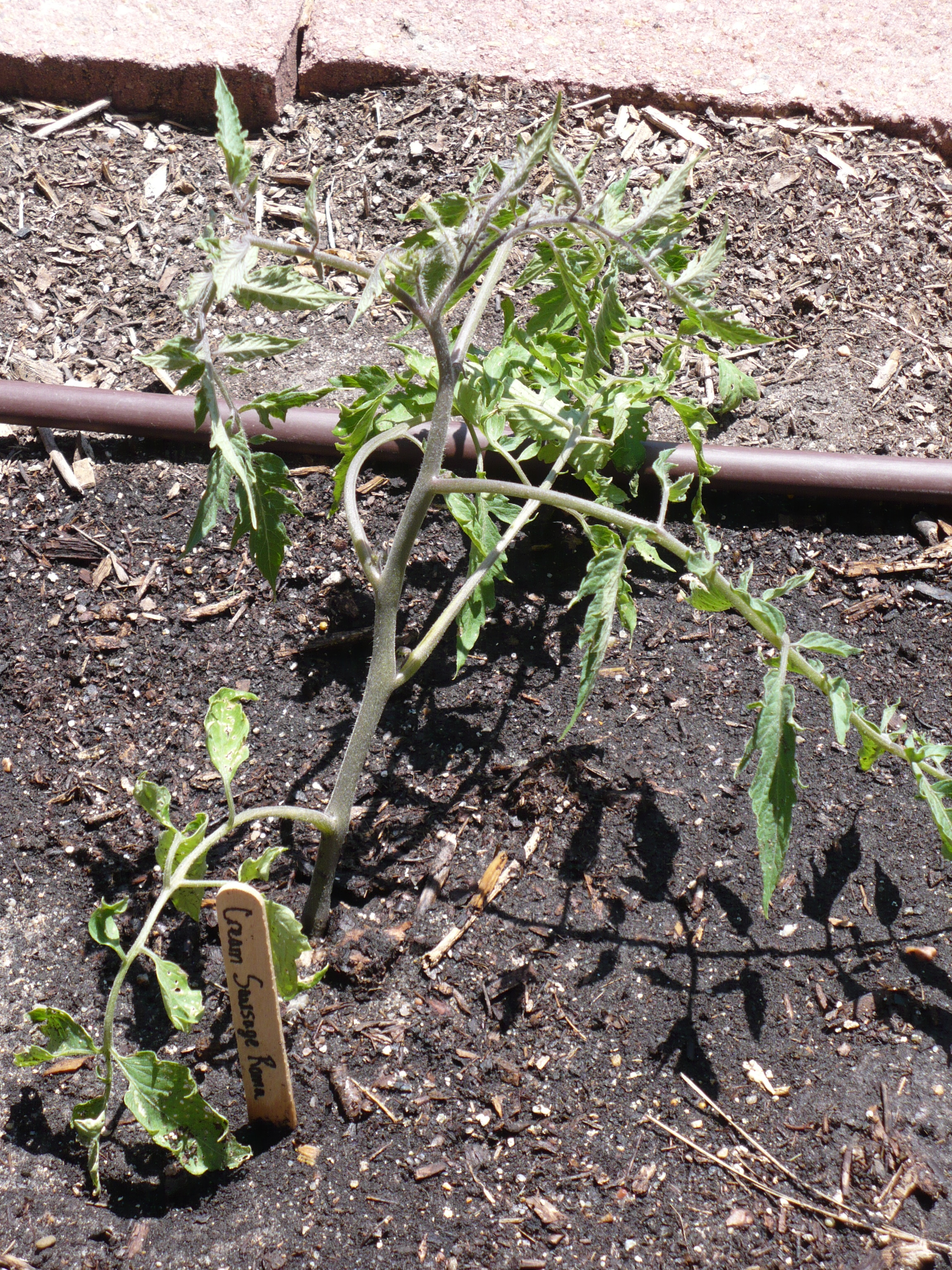This ‘Cream Sausage’ roma tomato is showing fairly typical symptoms of the tomato wilty gene. In my observations, it seems like Roma type tomatoes more often exhibit this problem. (This is not a scientific determination, just what I’ve experienced!) I also don’t know if this particular variety actually contains one of the mutated genes, just that it is showing that characteristic.