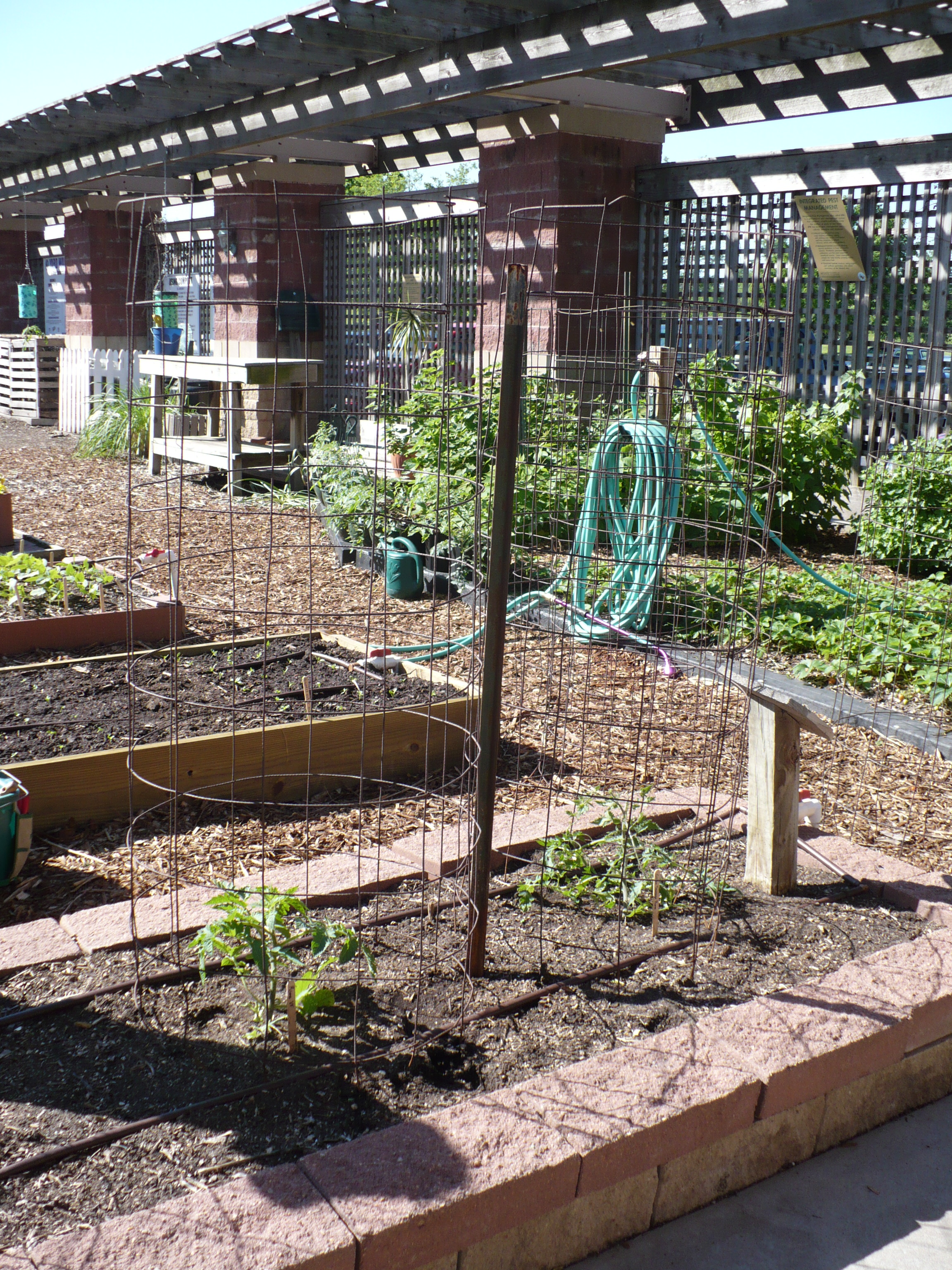 As usual on Tuesday morning, the Master Gardeners were hard at work out in the Demonstration Garden. The plan for today: training the tomatoes. We planted the tomatoes just 2 weeks ago, and they’ve grown a lot despite wind, thunderstorms, and flea beetles. It was high time to give them some additional support in their growth.