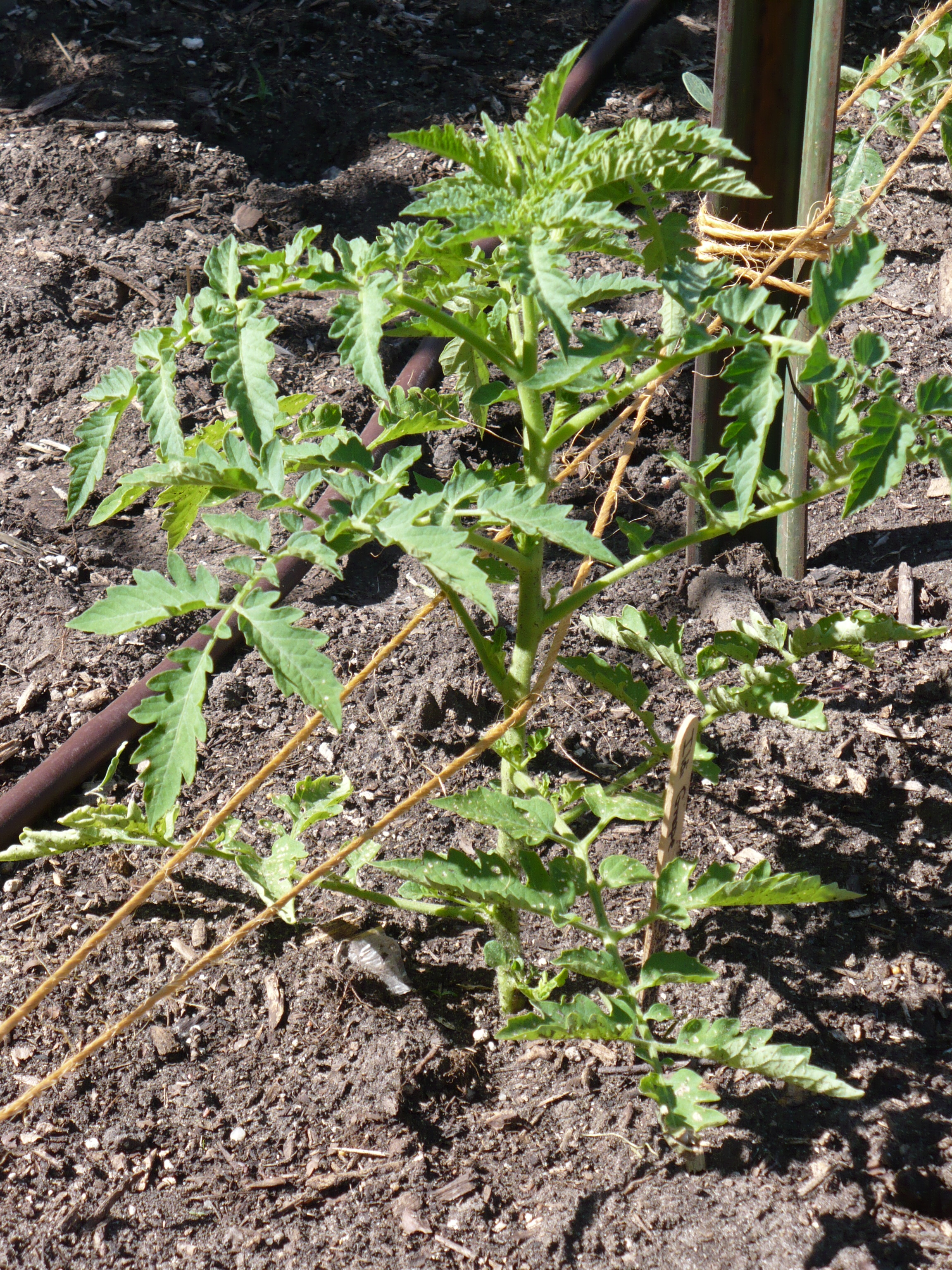 The cherry tomatoes are going to be trained using a system called Florida Weave. (Sometimes called Stake & Weave.)