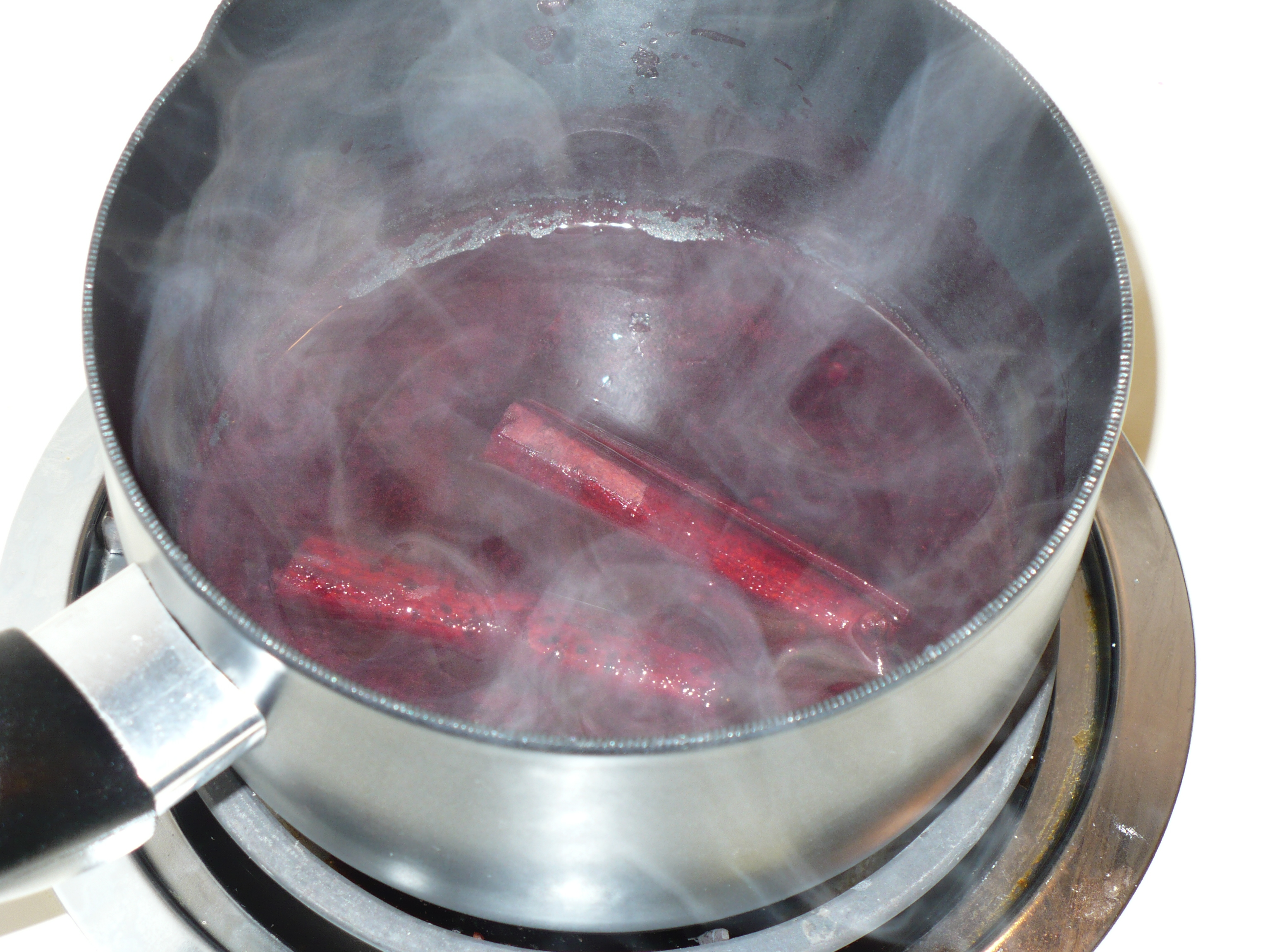 shredded beets were squeezed in a cheesecloth to yield about 1/2 cup of beet juice. The juice was then reduce to 1/4 cup with 2 cinnamon sticks and