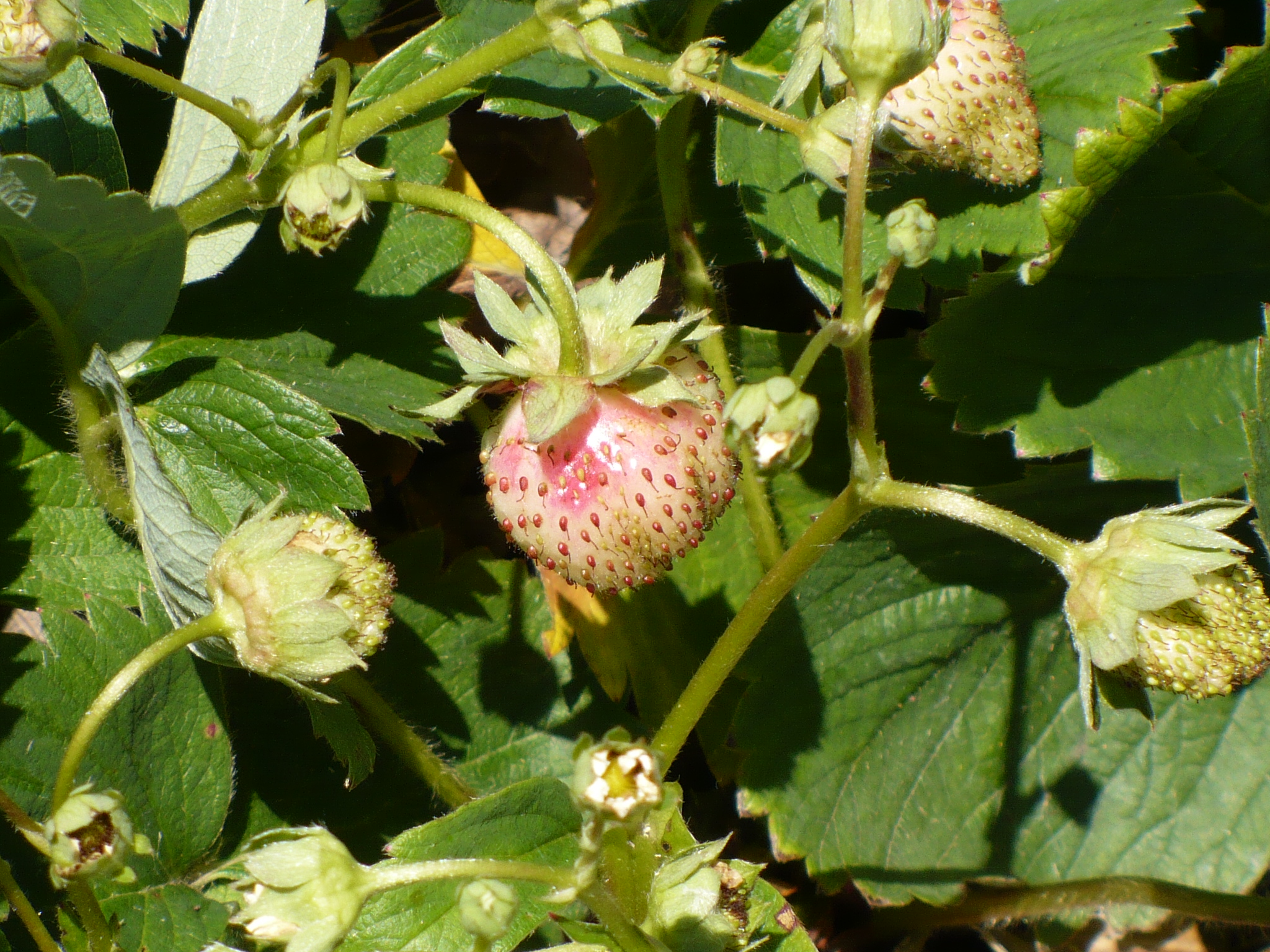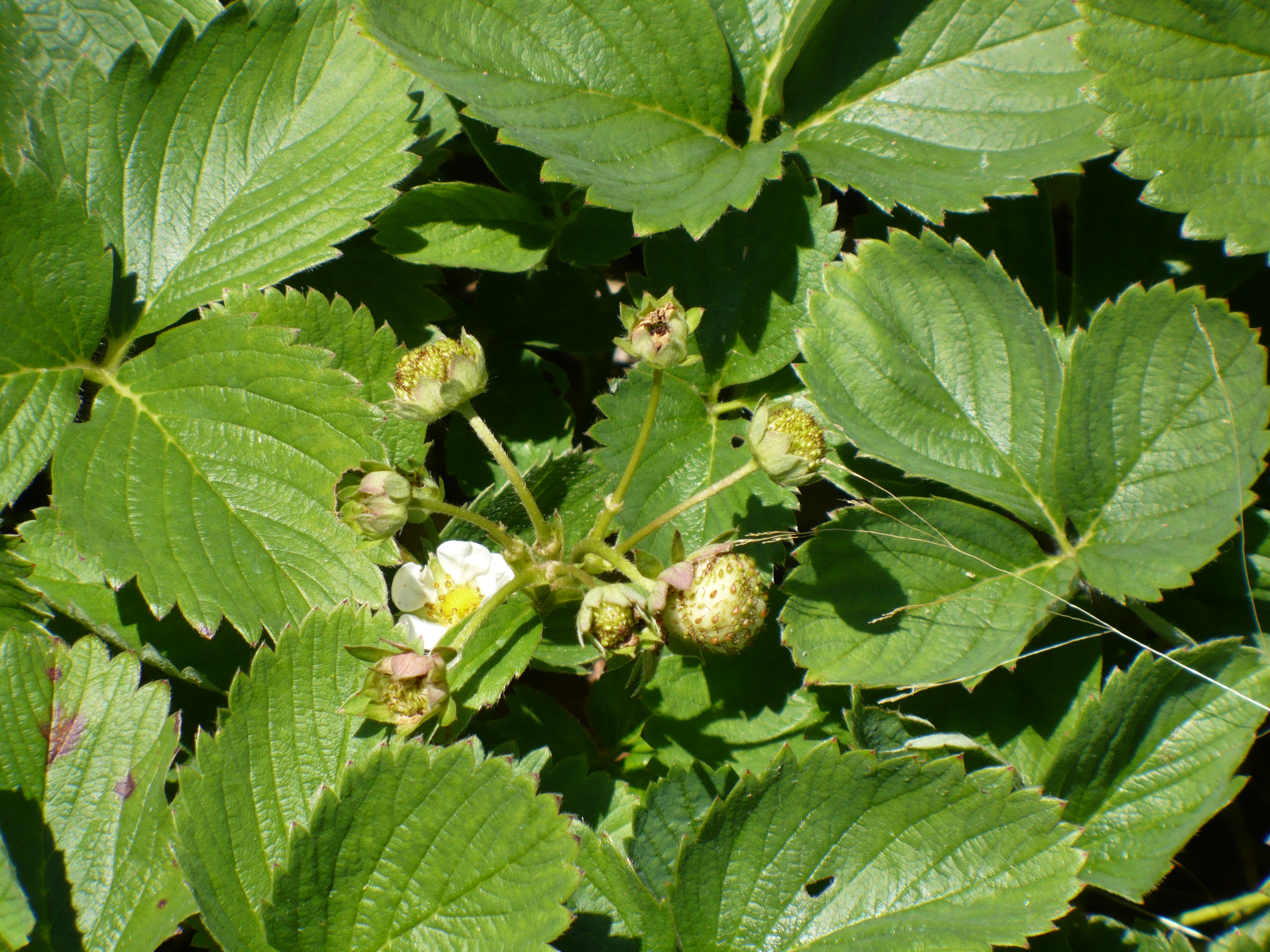 If you look closely at this picture, the top center blossom is black in the middle rather than green. This indicates that the blossom aborted in the heat last week rather than setting on a strawberry. So….my unofficial opinion is that this strawberry variety will set fruit under high temperatures, but over 95-100 is pushing it!