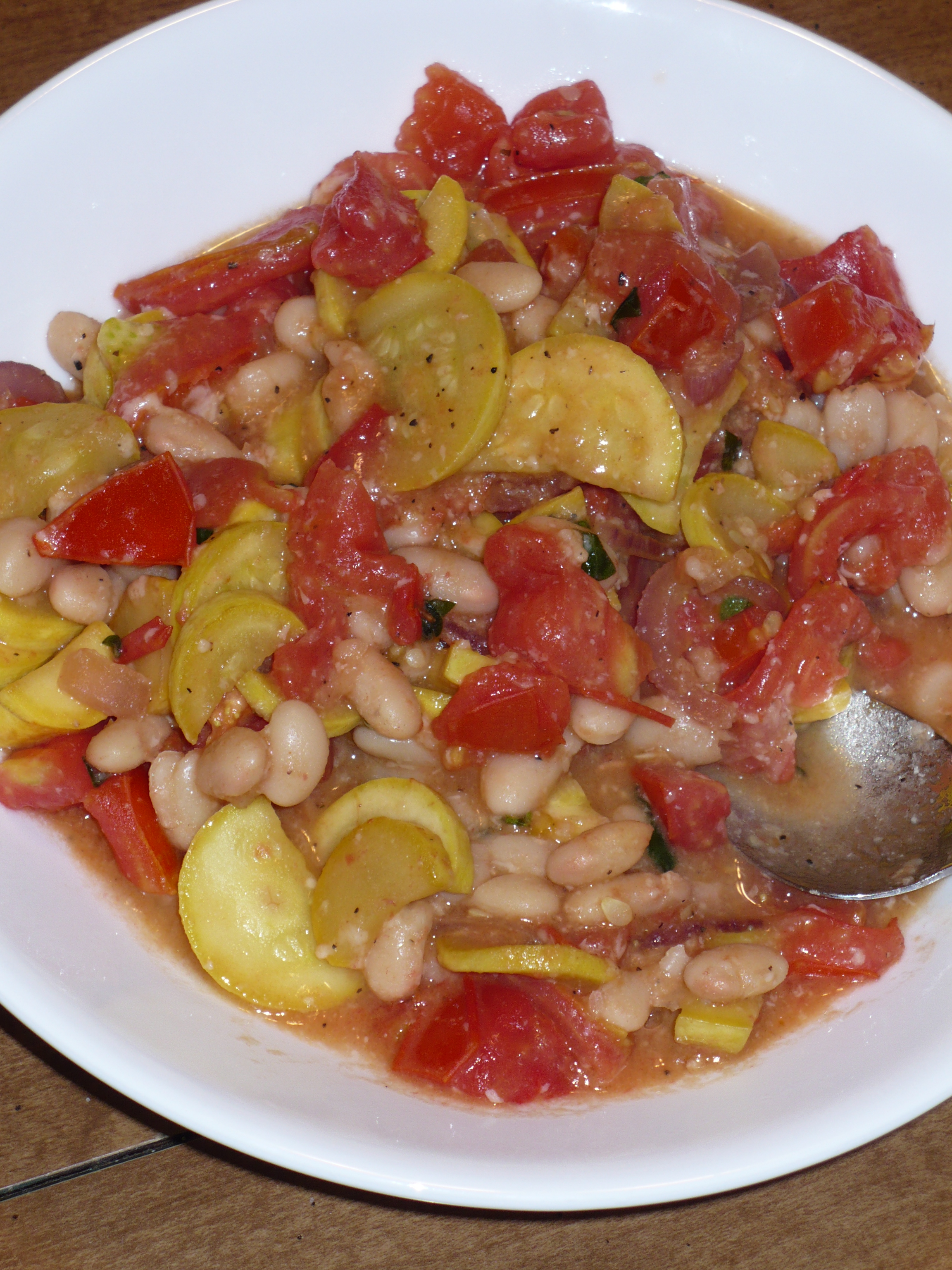 Last Friday we made this delicious Summer Squash & White Bean Saute, since we had a lot of tomatoes from the Demo Garden and some yellow squash from the Farmers’ Market. We liked it so well that we are going to have it again on Tuesday, but play with the spices a bit more.