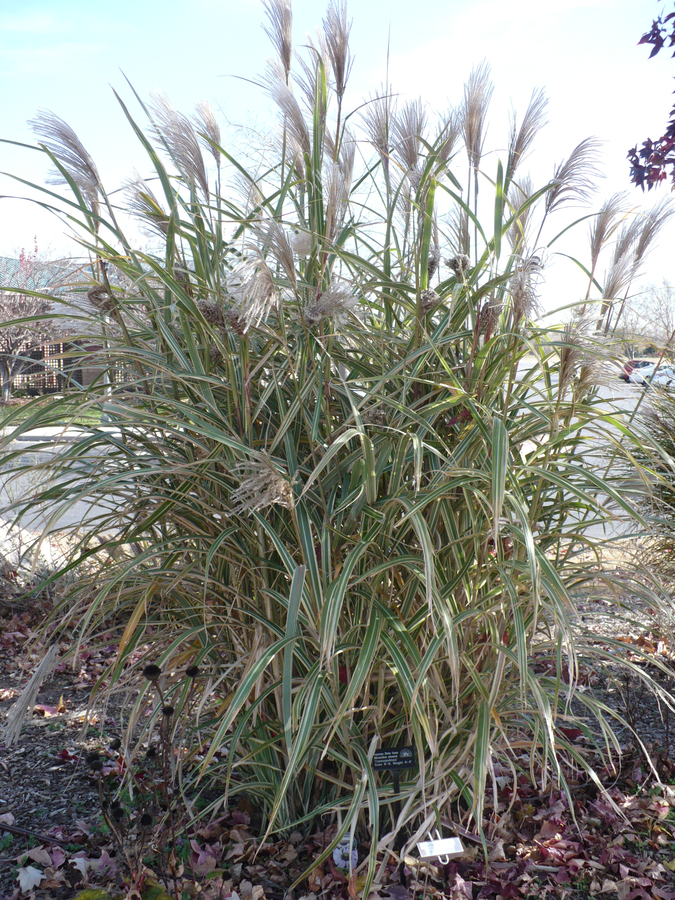 This ‘Cosmopolitan’ Japanese Silver Grass is definitely taller than I am. It has variegated leaves, and the silvery seed heads.
