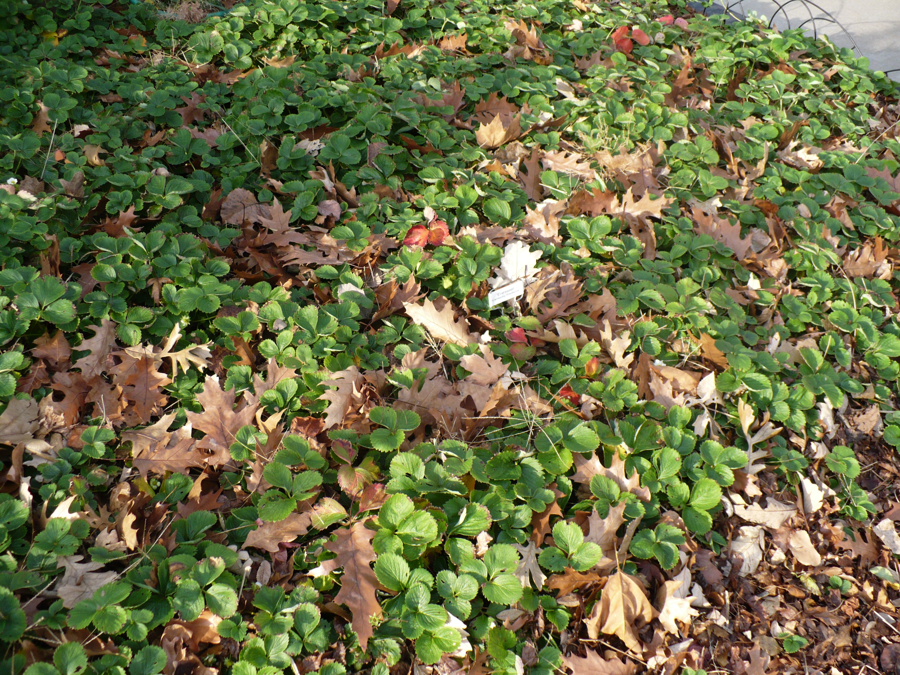 The leaves provide free, labor-free mulch for the strawberries over the winter, even though the mulch arrives a little bit earlier than necessary.