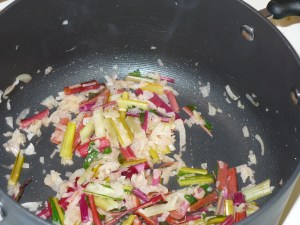 Here’s the onion and chard stems getting cooked in some butter and nutmeg. It’s so pretty, it has to be tasty! (The chard greens get added in too, just a bit later.)
