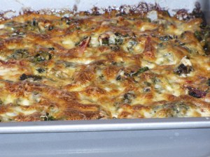 Mmm…it looks so delicious in its golden brown goodness! On first bite, I thought, ‘This is totally not worth the work.’ After the first piece, I thought it would be good once a year. After we’ve eaten the whole thing, it is definitely a good dish for a Friday night or some other night you have a little more time to cook, lots of chard available, and want something warm and tasty!