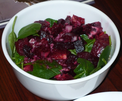 We also had 2 bags of blanched, frozen chioggia and red beets from my parents’ garden in Wisconsin waiting to be used. We ended up buying a bag of blood oranges on sale and made a really tasty beet & blood orange salad served on a bed of spinach. (Now if only I had a cold frame to grow spinach…)