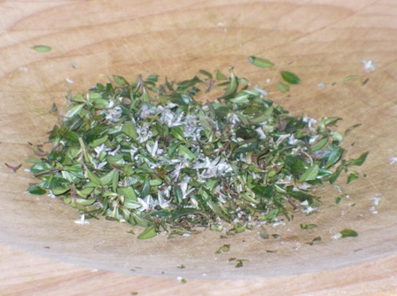 Ooh! Look what I found in the Demo Garden! I know you can’t tell what it is, but that, my dear readers, is thyme. Thyme is very winter hardy and can easily be harvested (lightly) all winter. Into the risotto with you!