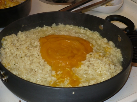 The butternut squash puree goes into the risotto rice when it is nearly done cooking.