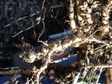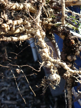 GRR! That is a very nasty look at the roots of the poor marshmallow plant. It had been rather yellow and wilty for a large part of last summer for no apparent reason. Well…now we know why! It is absolutely infested with root knot nematodes. Into the dumpster with the plant. Something else to watch for in that garden now.