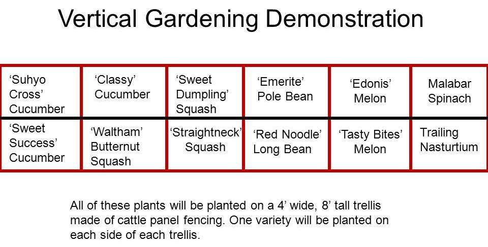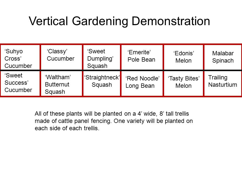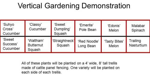 One of the more interesting gardens this year will be our Vertical Garden. We are planning to use the cattle panel trellis system for an entire bed (6 trellises) to grow a variety of vining vegetables.
