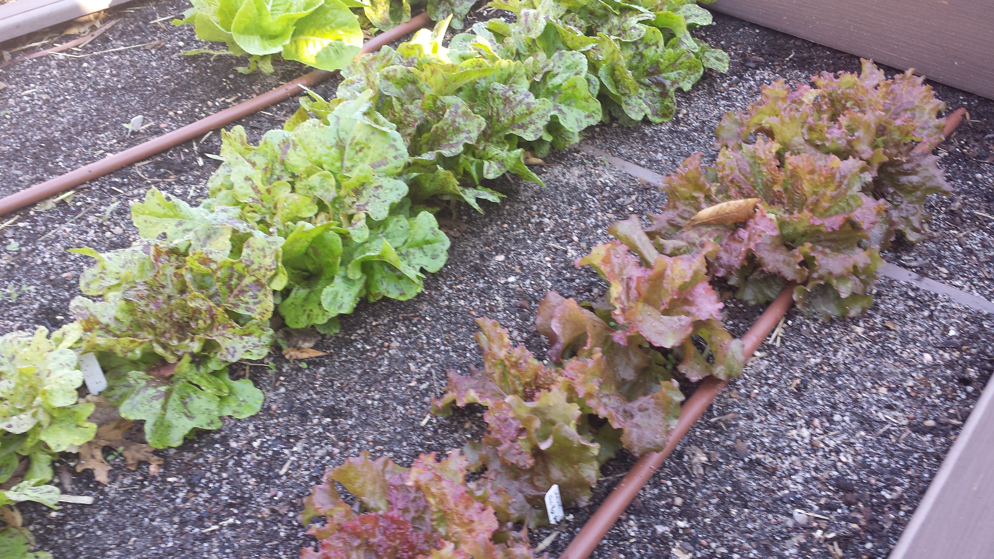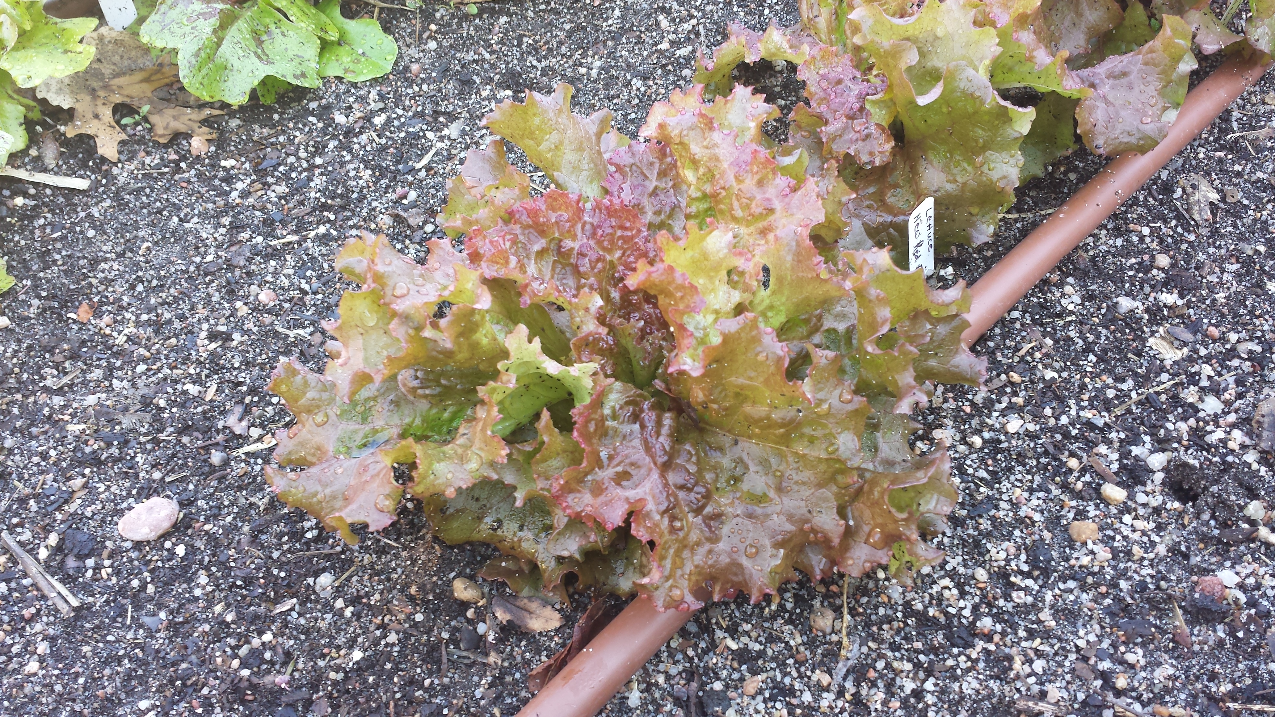 The lettuce that we started inside and transplanted is looking scrumptious! In fact, I believe they did a first harvest this week. The lettuce that I planted directly outside at home is about half this size, but harvestable due to thinning. The variety on the left is the ‘Flashy Butter Oak’ and on the right is ‘New Red Fire.’