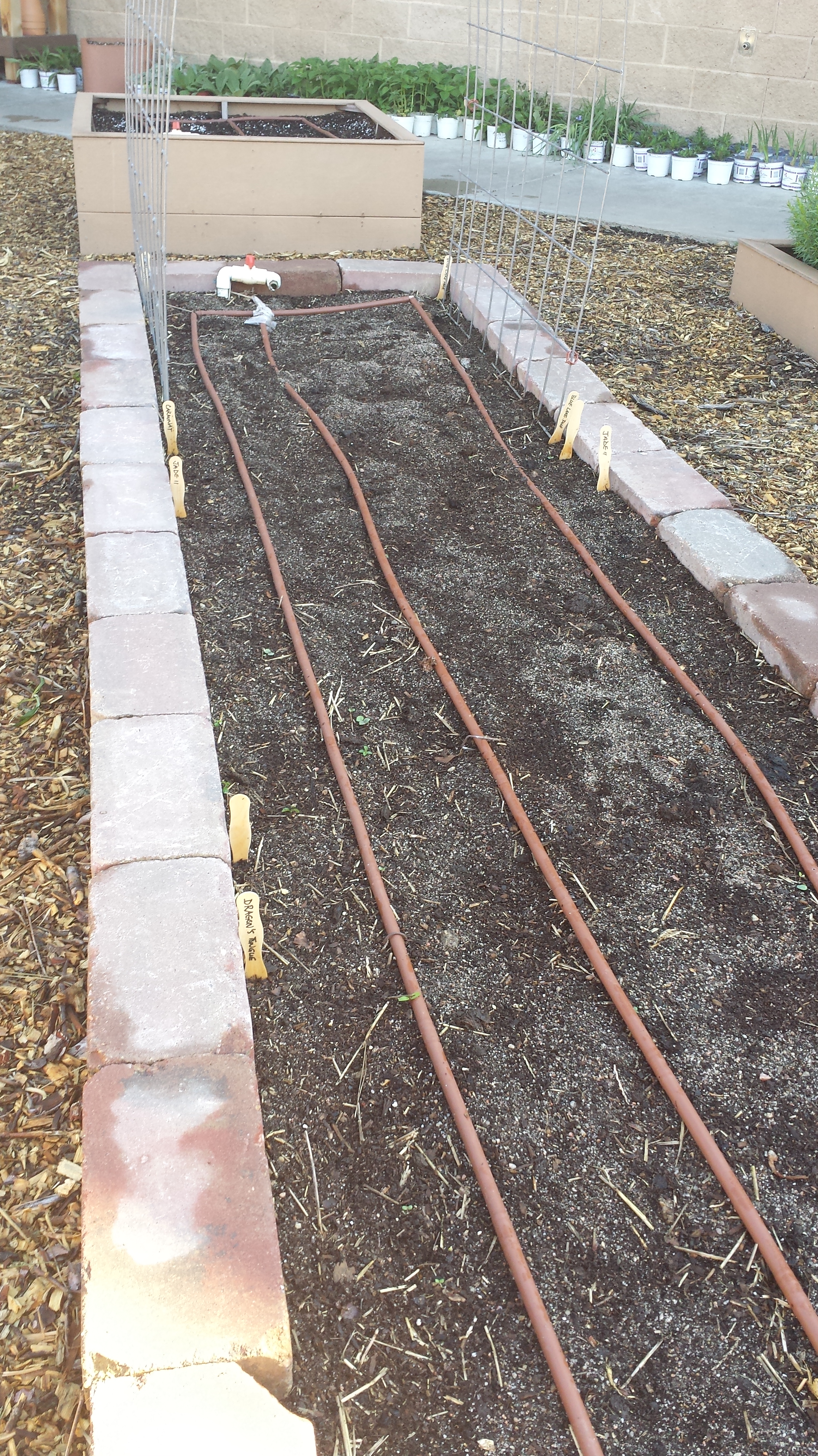 I know this doesn’t look like much, but our bed of beans was planted last week. At the far end is the trellis for the pole beans.