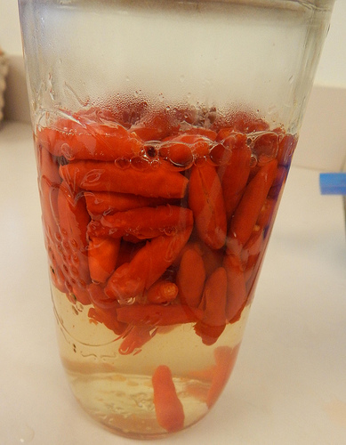 When working with hot peppers, I strongly recommend wearing gloves! As much of a pain as it is, it isn’t as painful as getting capsaicin everywhere I don’t want it.