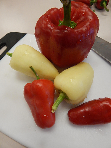 I ended up using one red bell pepper, two white sweet paprika peppers (Feher Ozon), and two red hot paprikas (Leutschauer).