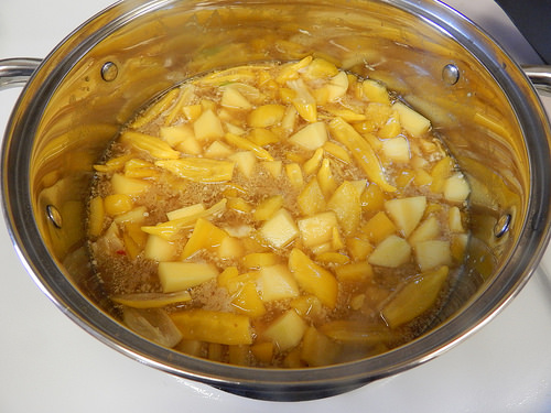 This recipe called for 8 oz. of the fresh Aji Limon peppers, 8 oz. of yellow bell pepper, 2 mangoes, brown sugar, and a bunch of vinegar and lime juice. I’ll be honest…I was afraid of how hot it might be.