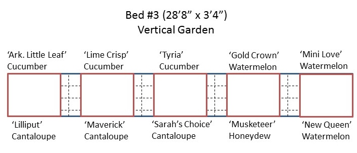 We have done cantaloupe in the past, but we have always stuck to the smaller fruited varieties. This year we have ‘Lilliput,’ which is a new personal size variety that is supposed to be very sweet. But then we chose two other varieties, ‘Maverick’ and ‘Sarah’s Choice’ that are larger. ‘Sarah’s Choice’ is a 3 pound melon, and ‘Maverick’ is a 4-5 pound melon. It will be fun to see how successful they are in the trellis system.