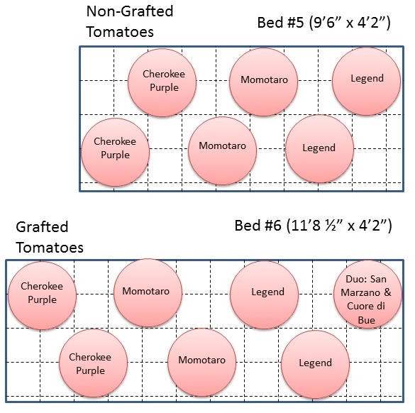 This year, because of our rotations, we needed to put the tomatoes in the shorter beds, beds 5 and 6. Since we have the two smaller beds, we thought it would be a good opportunity to try a comparison of Grafted vs Non-Grafted tomatoes again.