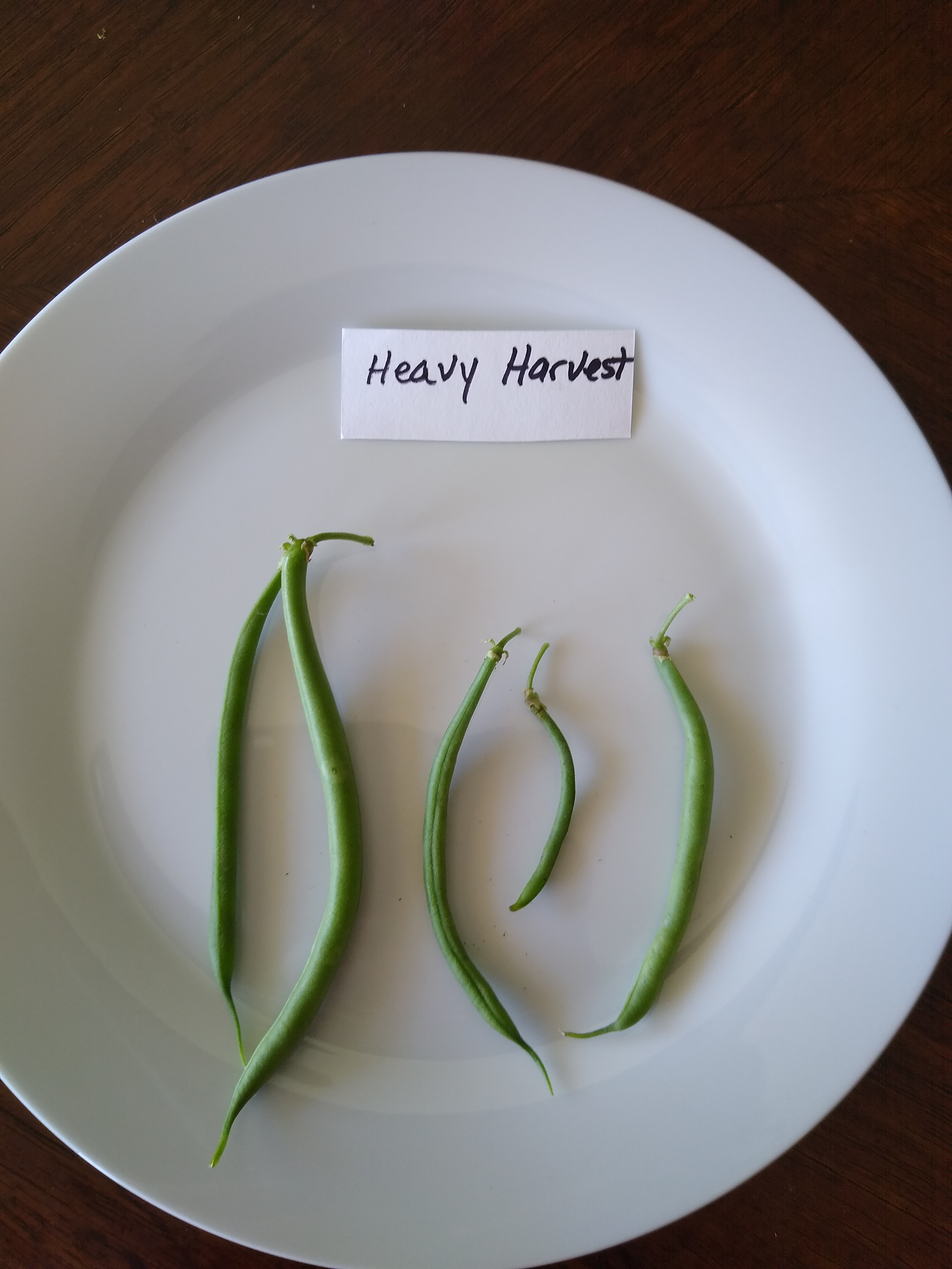 ‘Heavy Harvest’ is a 53-day bean. This medium green-colored bean is also slender and grows about five inches long. So far, it is not living up to its namesake in that it has only yielded a small amount of beans so far.