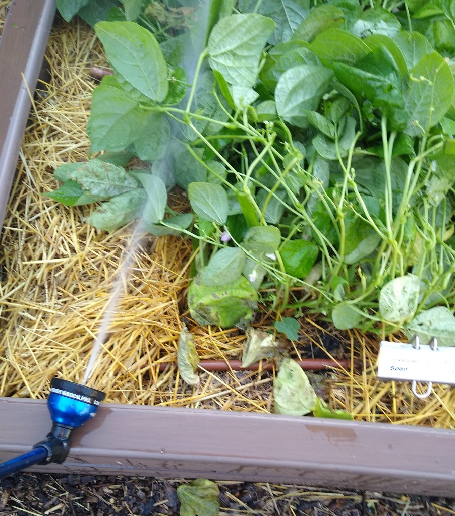 As a first defense against this garden pest, after harvesting the beans, we used the garden hose with a jet spray setting and shot the underside of the leaves with as much coverage as possible, and we plan to repeat this process a few times a week. Hopefully these pesky critters won’t ruin the harvest!