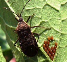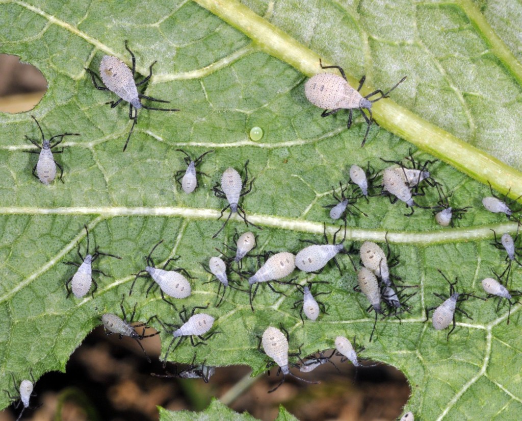 Another pest we are facing in the Demo garden is squash bugs. Adults look similar to stink bugs and can be found on many species of the cucurbit family, but squash is their favorite. Adults and nymphs (which are lighter grey with black legs) cause damage by sucking out juices from plant leaves, resulting in yellowing, wilting, and death of the plant when populations are large. Squash bug eggs can be found by scouting on the under sides of leaves – they are glossy brown and laid in groups in between leaf veins. These eggs can be scraped off and disposed of to help control, but here in the Demo garden, the problem has passed the egg stage, and we have begun chemical control to limit the damage. Squash bugs are best controlled at the nymph stage, since adults have a hard shell that protects them from pesticides. We have applied one round of spinosad by spraying it on the vine and branches where the nymphs are congregating. We won’t be able to harvest zucchini for at least three days after spraying, and depending on what the squash bug population looks like after the application, we may spray again in about a week. We use chemicals sparingly in the Demo garden, which are safe when used appropriately. As always… when using chemical pesticides, make sure read and follow the label! To learn more about squash bugs, click here.