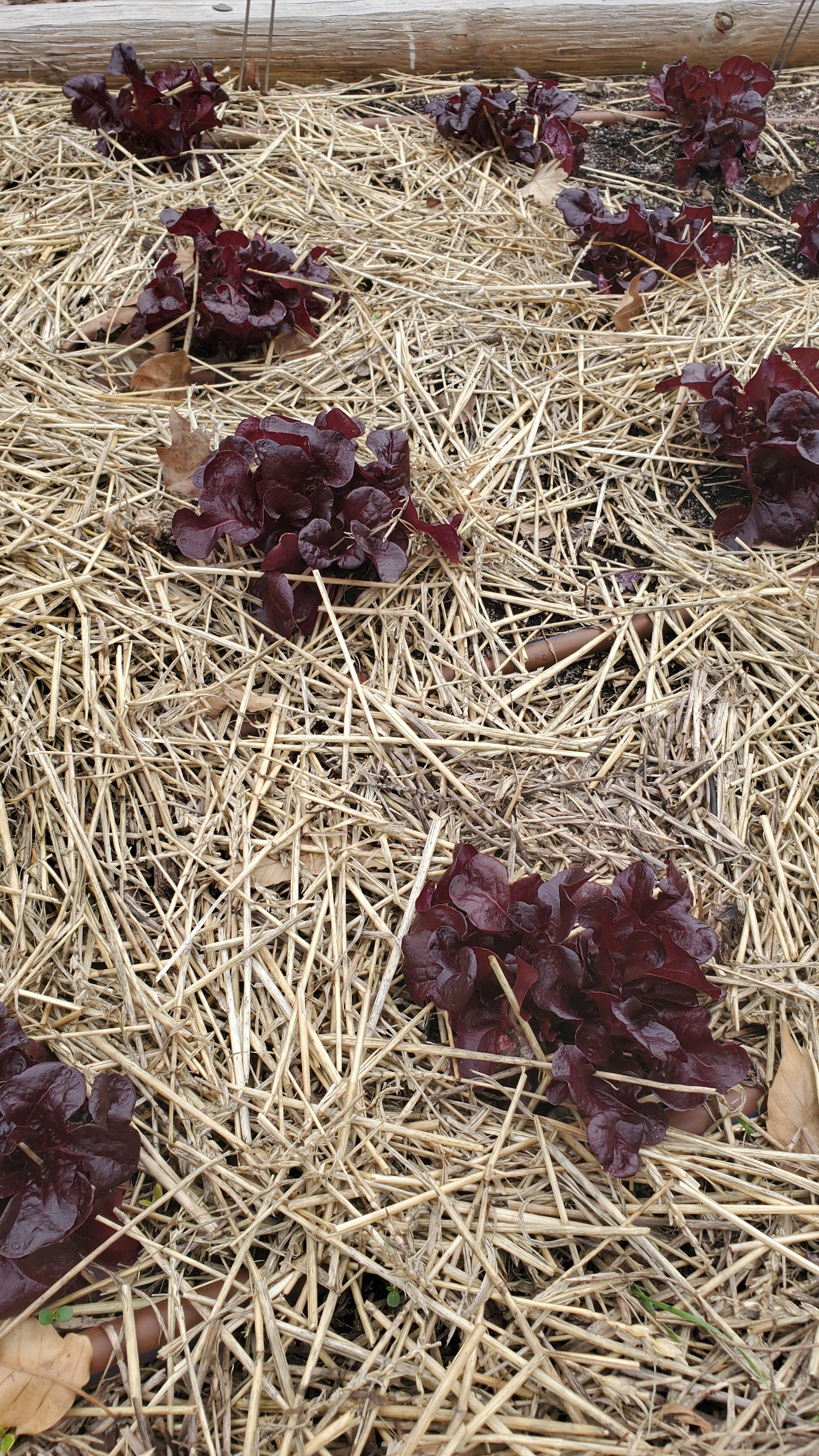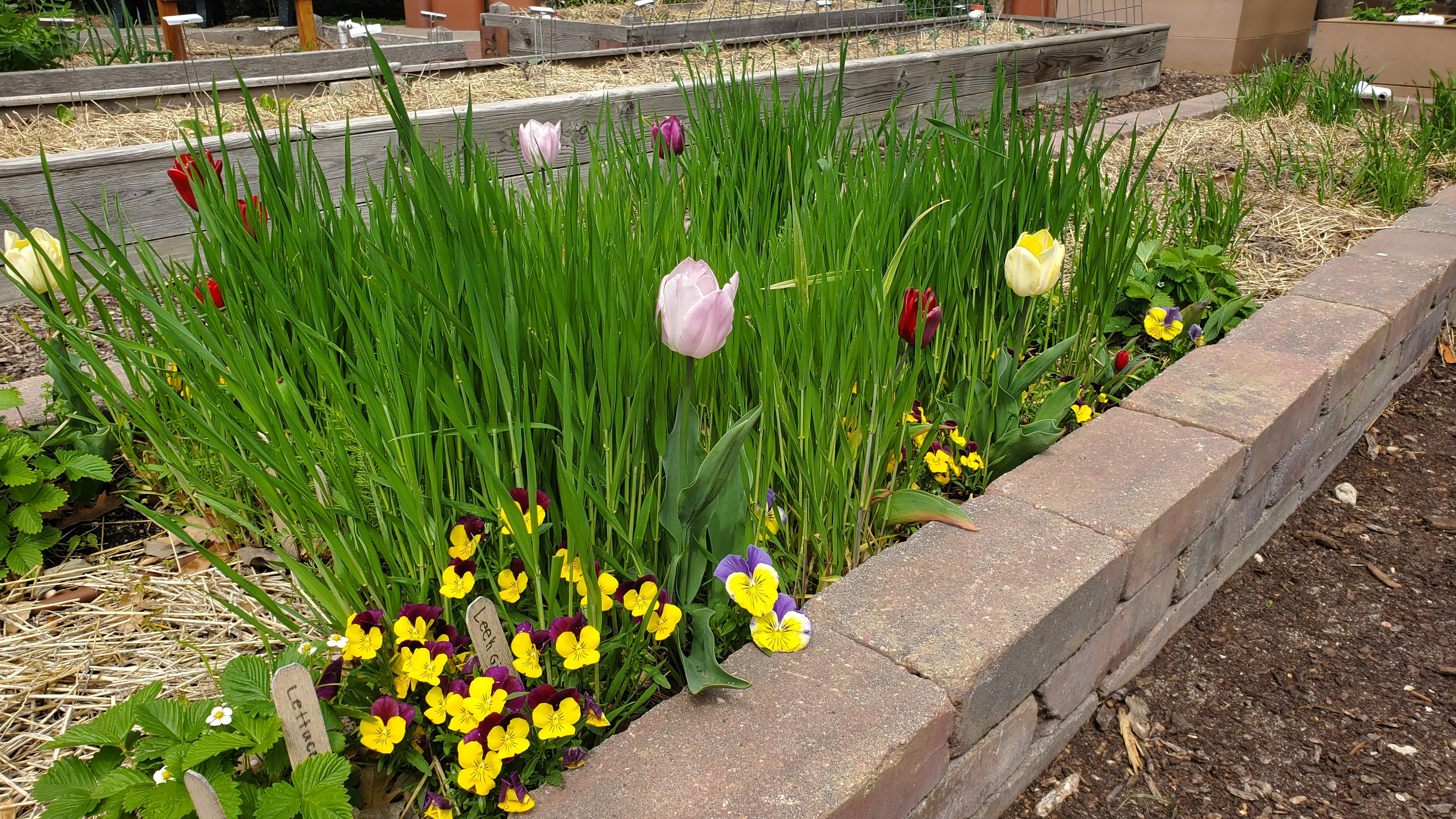 The templates are 4×8 layouts designed with high diversity (and relatively low productivity) for better interest and learning experiences in a school garden setting. (You can see all the templates and supporting information here: Kansas School Garden Guide.) Both of the templates shown here were designed to be planted last fall and overwintered. These overwintered with NO additional protection from the elements. They include pansies, tulips, garlic, shallots, alpine strawberries, barley or wheat, and vegetables (kale, carrots, red-veined sorrel, spinach).