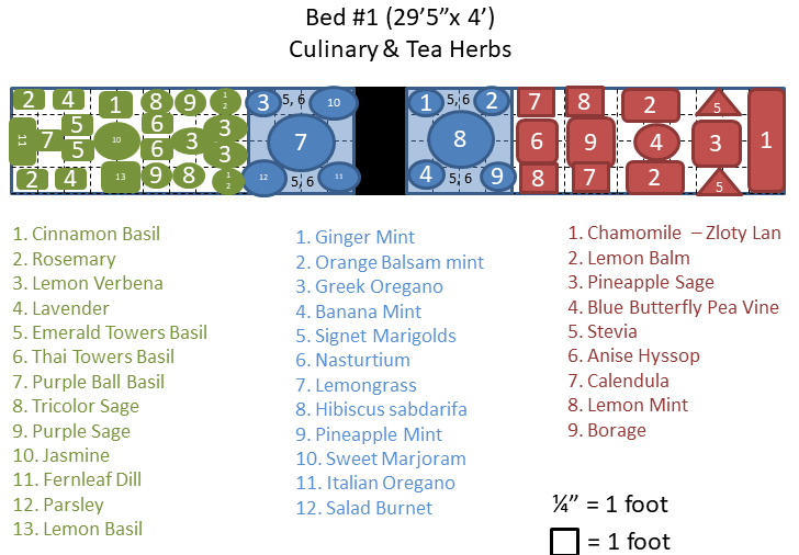 We have gone all out in filling our herb bed with a plethora of diversity! Very roughly, the green end are more culinary herbs (with some crossovers) and the red end is more tea herbs (again with some crossovers/dual purpose plants). The blue center is pretty much a mixture. Because the blue center sections of the bed had really terrible nematodes last year, we will be planting the majority of the plants will be in large containers, except for the marigolds, oregano, marjoram, salad burnet, and nasturtiums which are “supposed” to have some resistance to the nematodes.