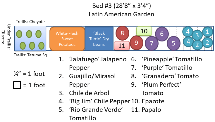 In Bed 3, we have chosen a “Latin America” theme. We have jalapeno, Guajillo, anaheim, and chile de arbol peppers, all common in Latin America. We will have three different varieties of tomatillos: one green, one purple, and one sweet yellow. Tomatillos produce best when there are at least two different varieties for pollination. We chose two paste tomatoes (nematode resistant!) for this garden, as well as two Mexican/Latin American herbs: epazote and papalo. On the left end of the bed, we will have a round Mexican squash that is supposed to be resistant to squash vine borer, as well as Chayote squash. We aren’t sure that the Chayote will produce this far north, but you have to try things, right? Under the trellis we will be growing a whole bunch of cilantro in the spring and then let it flower and go to seed for coriander in the summer.