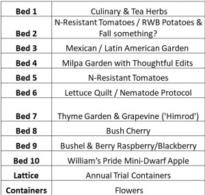 Bed 2 was the only bed that didn’t have nematodes visible on the plant roots when we cleaned up the garden last fall. Whether that was because of the hot peppers populating most of the bed or other factors, it is hard to say. But with that in mind, we are using half of the bed as our “control” for our nematode resistant tomato cultivars. We chose 5 cultivars that are known to have resistance to nematodes, and one variety, ‘Chef’s Choice Orange,’ that is not identified as having nematode resistance, but that we have grown successfully here in the past. We will have the same cultivars planted in Bed 5, which had very high levels of nematodes last year so that we can compare the performance of the varieties in each bed. In the other half of the bed we will have red, white, and blue potato varieties in the spring and some cool season leafy greens in the fall.