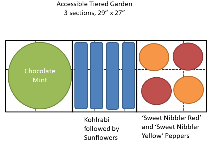 In the accessible garden spaces, we are leaving the chocolate mint in place for another season. The center section will have a spring planting of kohlrabi, followed by some short ‘Short Stuff’ sunflowers for the summer. The right section currently has spinach that was overwintered, and will be replanted with some snack pepper plants come May.