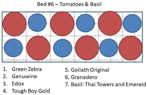 As we saw earlier with Bed 2, we are splitting our tomato plantings again this year. We are also continuing with the nematode-resistant theme for the garden. Since we solarized this bed last year, we are hoping that the nematode population is minimal or gone, but we are still playing it safer. We have two varieties – Green Zebra and Genuwine – that do not have nematode resistance. These will be our “control” varieties to see if we get nematode activity after the treatment last year. The other four varieties have nematode resistance. This will help keep the population (if any) of nematodes in that garden low. We are also reprising the two basils we had last year, simply because they were pretty amazing varieties and we thought we might as well keep them going.
