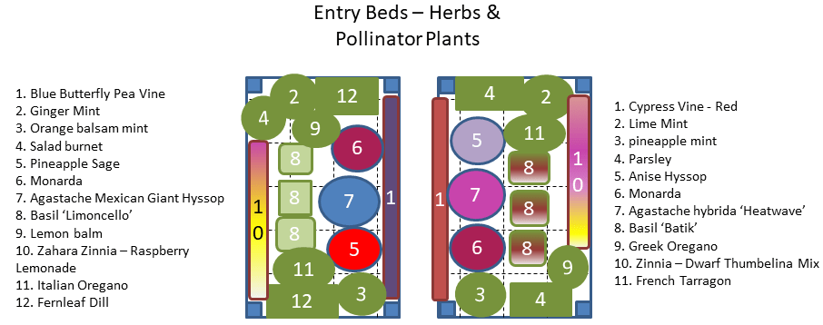 If you came out to the garden at all last year, you probably noticed our rebuilt entry beds. We went simple with them last year, but this year we plan to take full advantage of the trellis/pergola to grow some Cypress Vine and Blue Butterfly Pea Vine. We have also located our herbs and pollinator plants out there as well. We are hoping for an attractive and welcoming display in the parking lot!