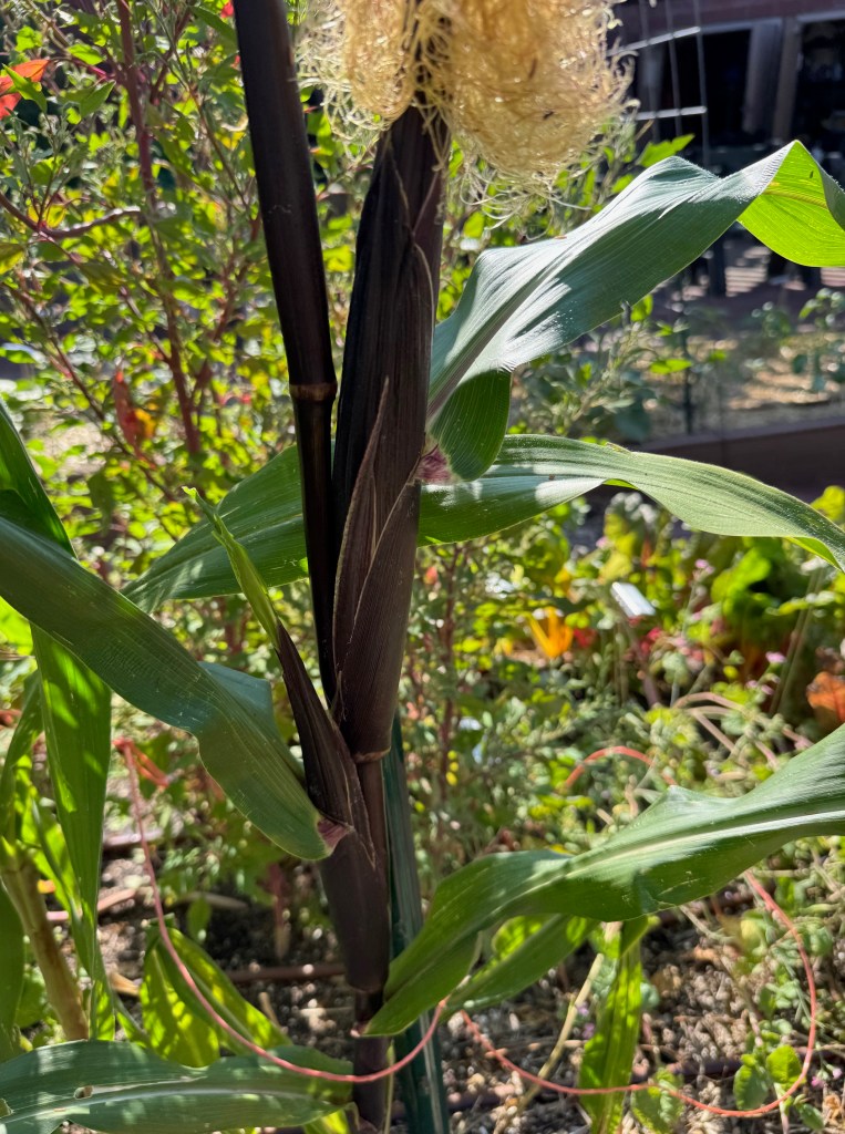 Familiar plants such as cilantro, Swiss chard, and kale have already been harvested from the Mexican Garden. Now, we are starting to harvest huauzontle (Aztec red spinach), Hopi red dye amaranth, and varieties of corn.