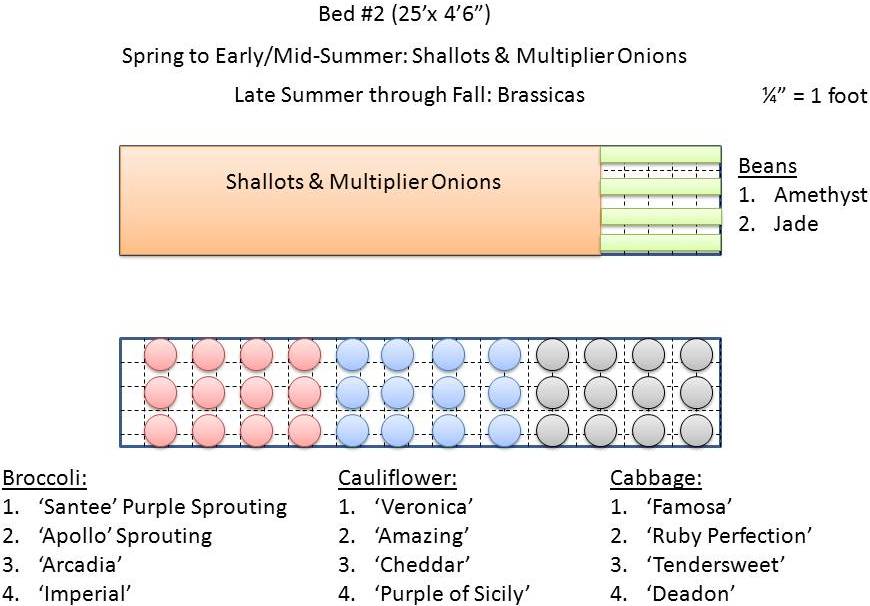 So the majority of the bed is full of shallots, multiplier onions, and elephant garlic at the moment. (For more information on the garlic and shallots, go here.) There is about 5 feet at one end where we had some lettuce last fall. In that open space, we will be planting two types of bush beans: Amethyst (purple) and Jade (green). Everything in this garden should be ready to harvest/remove by sometime in July.