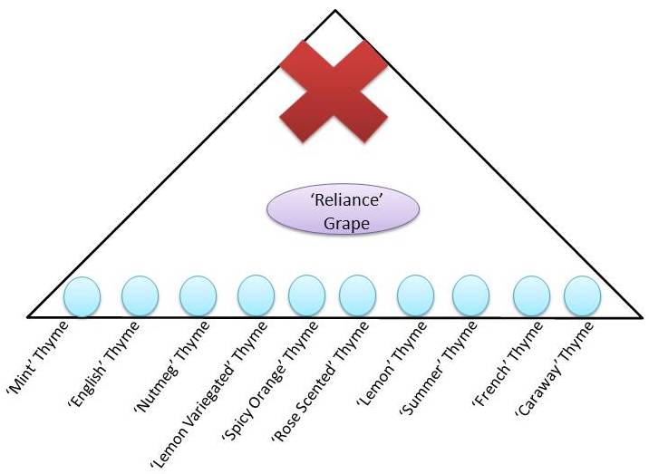 Bed 7 is the triangular bed in the corner of the garden. It contains the ‘Reliance’ grape vine and trellis as well as a variety of culinary thymes.